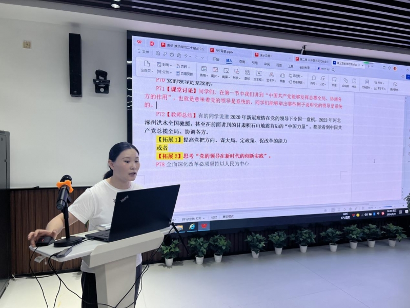 会上,戴启生、马文娟两位教师分别就“以中国式现代化全面推进中华民族伟大复兴”和“ 坚持党的全面领导”两个专题开展教学内容与教学设计分享。沈宗阳、虞恬、齐雅芬三位教师就周末理论大讲堂“教学展示:党的二十届三中全会精神融入《习近平新时代中国特色社会主义思想概论》课程”分享自己的学习体会。张邢宇以“在日常教学中如何运用学习通”为主题分享了如何提升教师数字素养。随后,大家对集体备课内容进行点评、讨论,有效地提高了集体备课会的质量和深度。